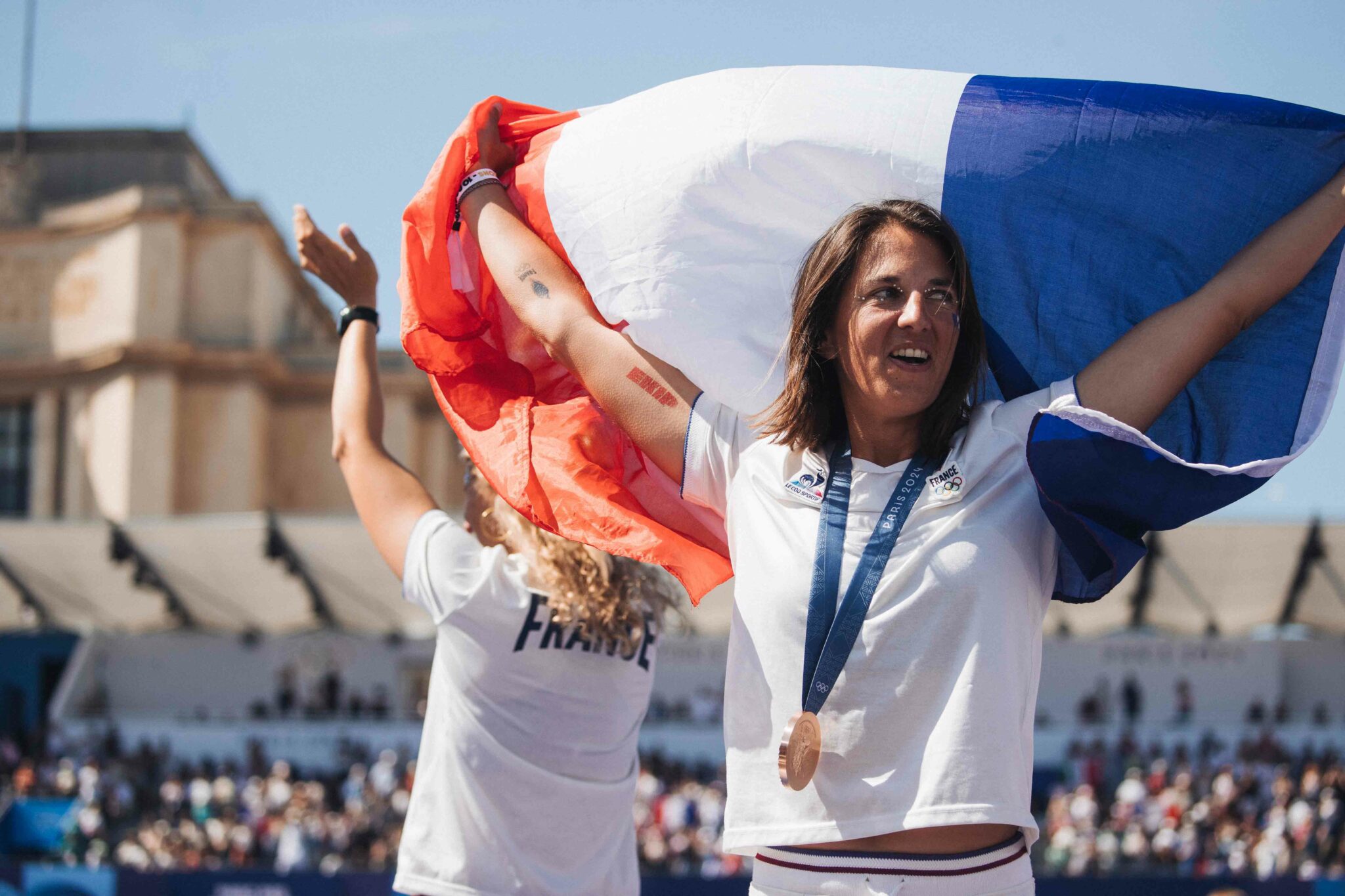 Oui, les filles étaient engagées dans les épreuves de voile, à Marseille donc, et la scène se passe après, à Paris, au parc des champions qui était installé au Trocadéro. Ce que j’aime avec ces photos, c’est que l’on sent toute la fierté de se retrouver là, d’avoir réussi un exploit. On voit peu les athlètes qui évoluent dans les épreuves de voile, leur avoir offert cette opportunité de venir célébrer et profiter de leur exploit dans le cœur des Jeux, on sent tout le bonheur qui est le-leur, ce sont des instants de joie immense. Je n’intègre pas systématiquement le drapeau dans mes photos mais là, il avait été donné à Charline Picon et Sarah Steyaert, si je me souviens bien, par quelqu’un dans le public. Moi, je prends la photo juste après qu’elles l’aient pris et soulevé.