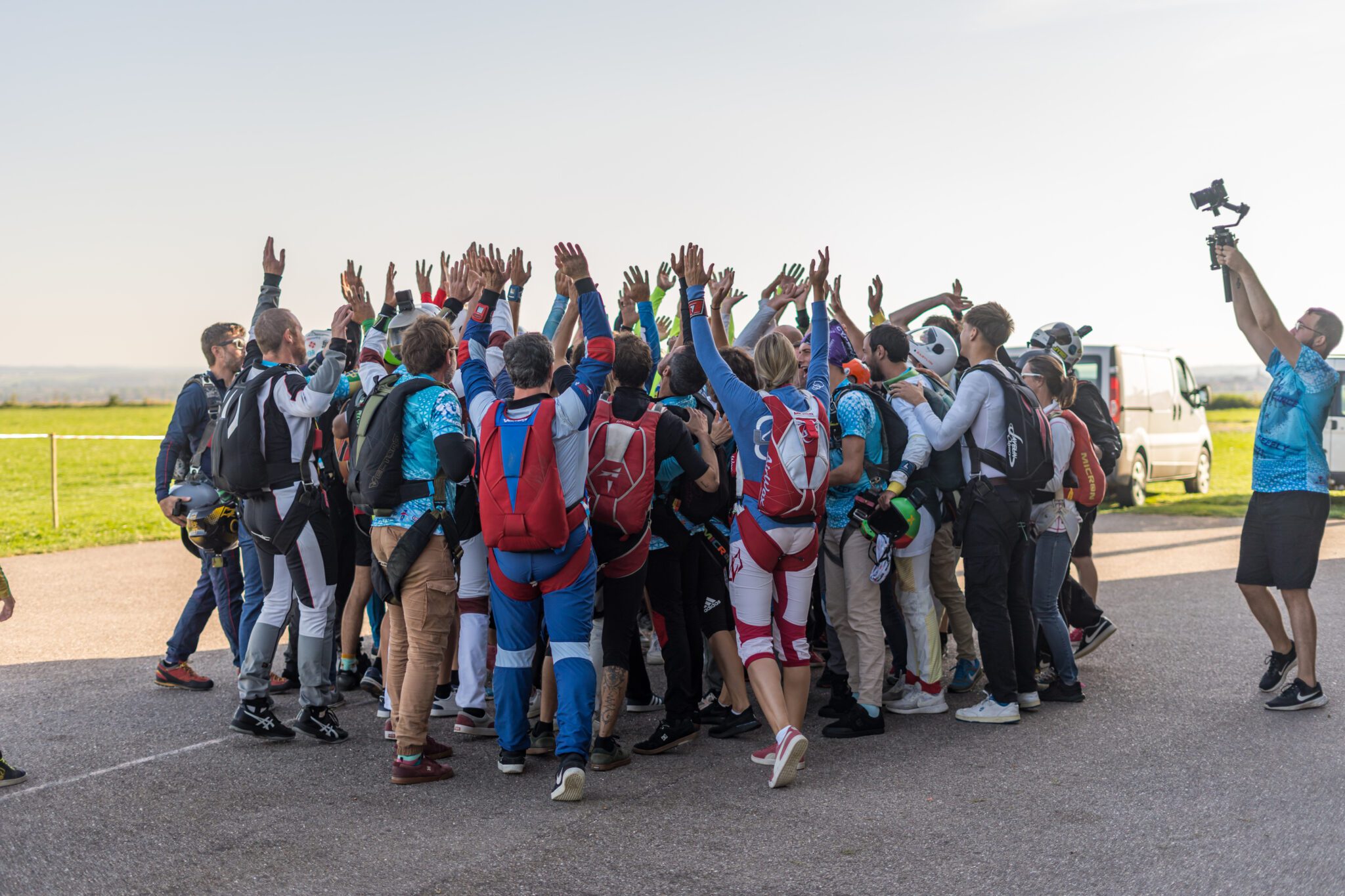 Dans les records en formation, il n’y a pas de composante artistique, on recherche le chiffre, soit le plus grand nombre de personnes accrochées l’une à l’autre en vol. On a déjà fait des tentatives à 100. Une ou deux fois, on a réussi à accrocher 97-98 personnes. Mais ça n’a pas pu être comptabilisé car on avait déposé un plan pour 100 personnes.