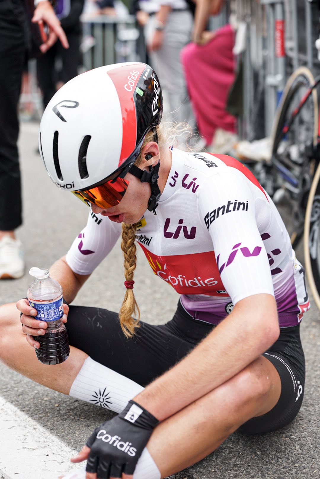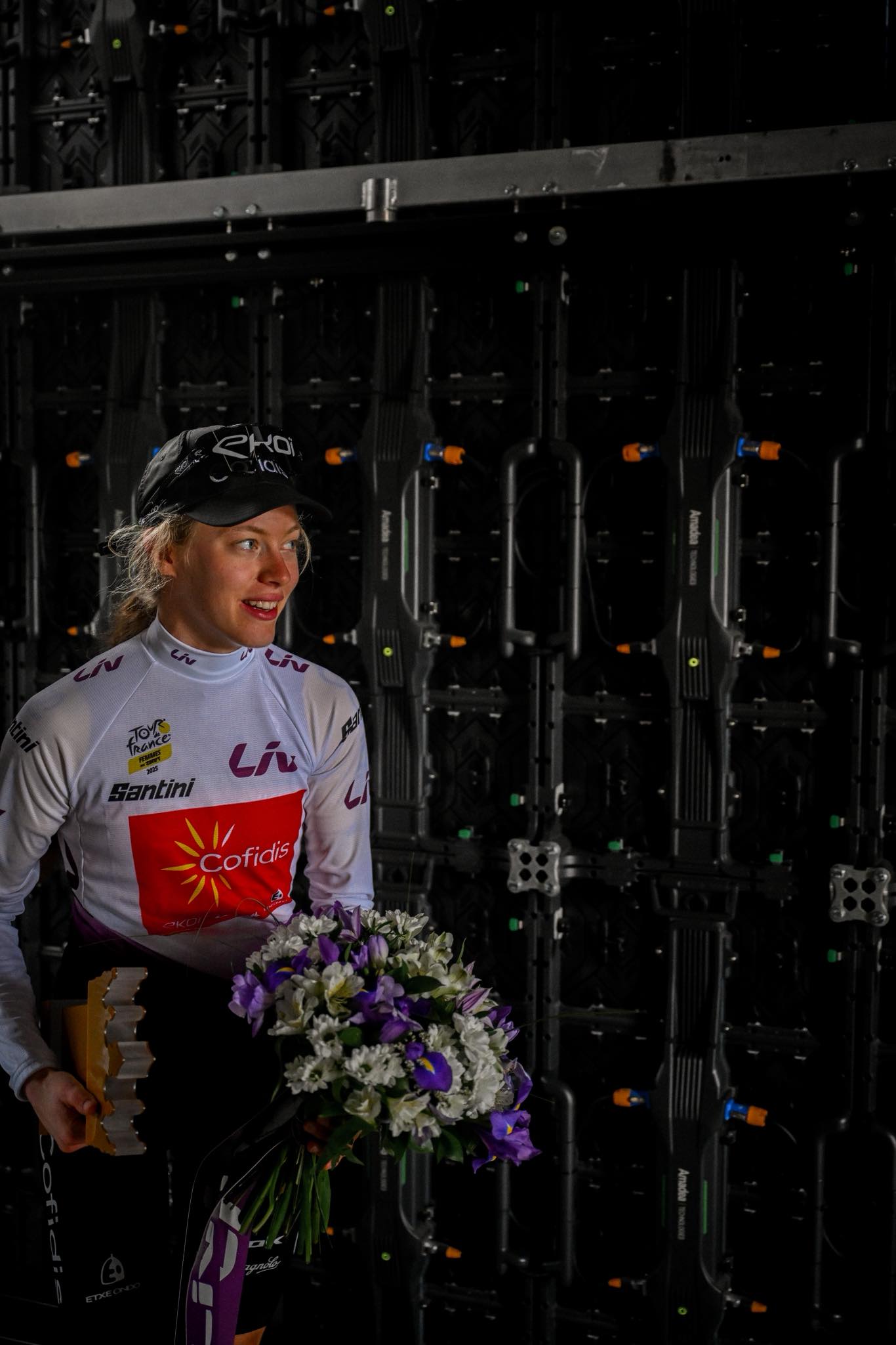 On sait que ça se passe en vrai, mais c’est quand même très compliqué. On se dit qu’il faut profiter au maximum et plus ça allait, plus j’arrivais à vraiment lever les bras quand je montais sur le podium, à prendre vraiment du plaisir parce que, moi qui étais un peu timide, j’étais chaque fois un peu plus à l’aise. Mais, pour l’anecdote, le premier jour, je ne pensais pas que j’étais maillot blanc. Quand je franchis la ligne, personne n’est là pour me le dire. C’est une fille que je connais et qui a le même âge que moi qui me dit que c’est moi le maillot blanc. Puis, il y en a une deuxième qui me dit la même chose. À ce moment-là, je commence à penser que ça peut effectivement être pour moi, mais comme personne ne me le confirme, je rentre au bus et là d’un coup, à la radio, on me dit qu’il faut que je revienne au podium. C’était assez cocasse comme manière d’apprendre qu’on est maillot blanc !