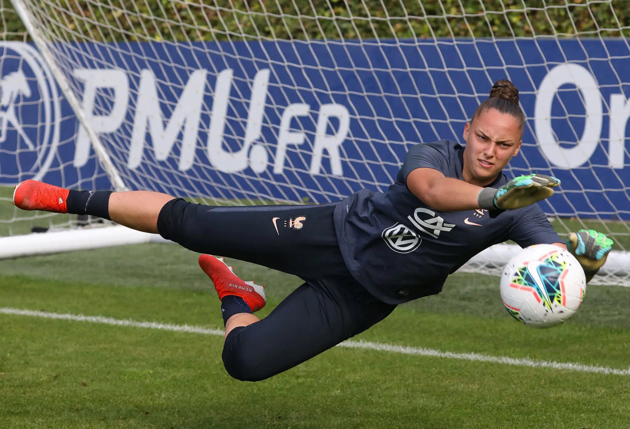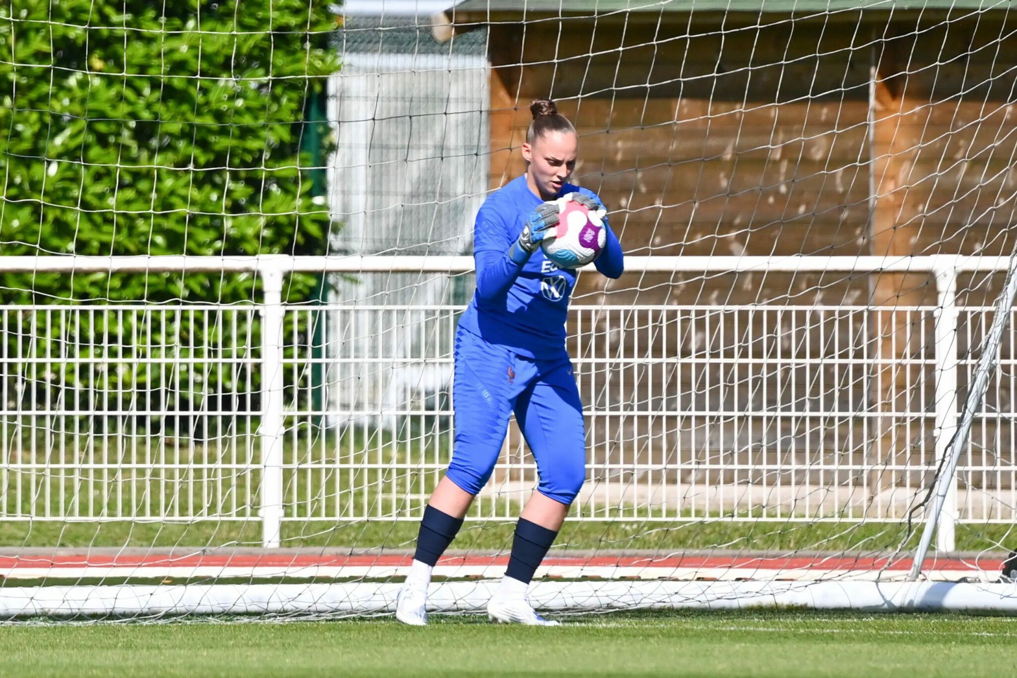 Troisième portière des Bleues, elle n'a qu'une envie : entrer en jeu. Du haut de ses 25 ans, Justine Lerond, gardienne du Montpellier HSC, a déjà joué sous le maillot tricolore de toutes les catégories juniors. Fouler la pelouse avec celui de l’équipe A, voilà ce qui lui manque ! L'Euro qui approche lui donnera-t-elle enfin accès à ses cages ?