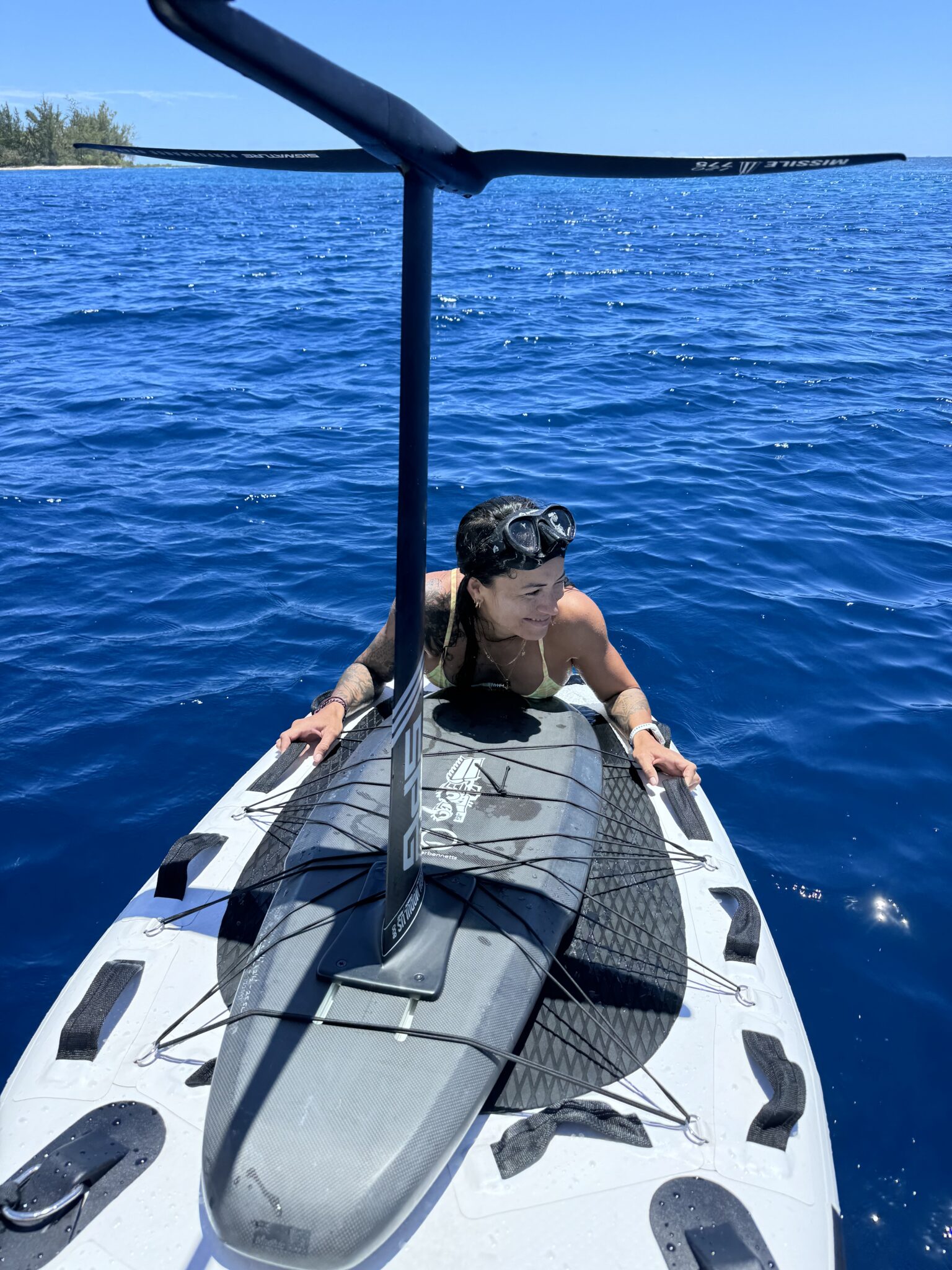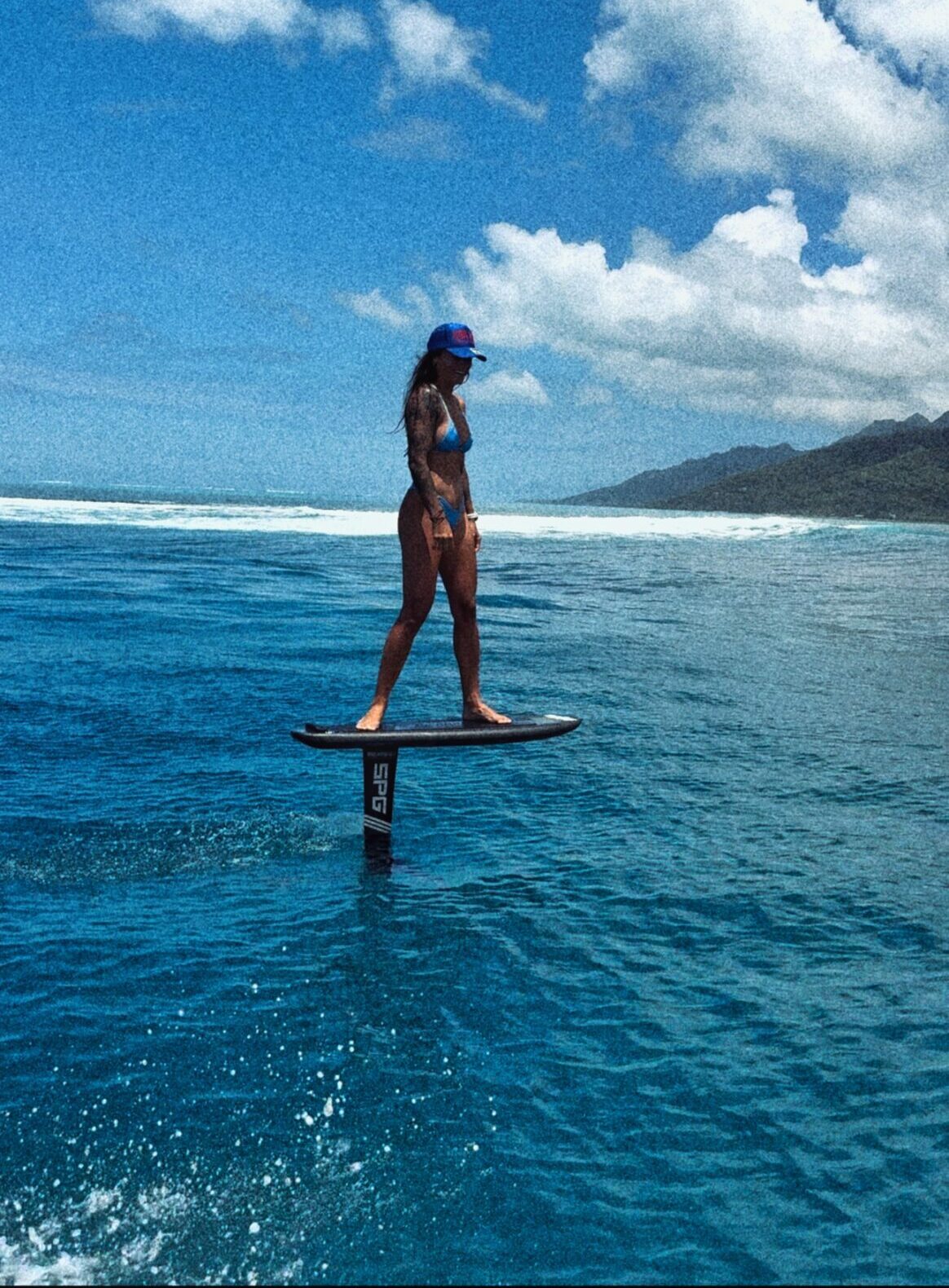 Je pratique le foil tractée derrière le jet ski et on nous lance sur des vagues de récifs. On va au large attraper les vagues de l’océan et rider de vague en vague. On va, comme ça, de Tahiti à Moorea, l’île qui est en face. Il y a un petit chenal de 45 minutes de navigation en foil. Je fais aussi de la wing foil, où l’on surfe avec un foil et une aile de deltaplane. Ce n’est pas ma discipline préférée en foil, mais j’y arrive. J’adore ce sport parce que, peu importe la météo, qu’il y ait du vent, de la pluie, des vagues, de l’eau plate, ce que tu veux, il y aura toujours un moyen de faire du foil. Quand la mer est calme et qu’il n’y a pas de vagues, on va rider derrière le bateau. Ensuite, s’il y a de la houle, le jet-ski va nous poser sur la vague, il suffit de lâcher la corde et tu rides comme un surfeur. Ensuite, il y a le downwind au large. C’est quand il y a du vent et de la houle dans l’océan, en dehors du lagon. Pour le pratiquer, il faut du vent à fond la caisse parce que tu n’as pas de moteur sur le foil. Dans ce cas-là, tu rides pendant des heures de bump en bump, c’est comme ça qu’on appelle les vagues de l’océan. Bref, c’est la régalade à chaque fois !