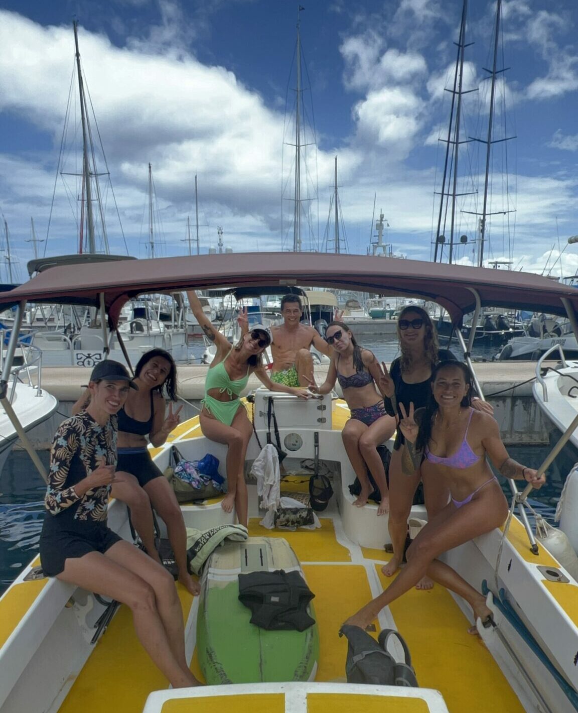 Et puis, il y a la connexion féminine, ça, c’est immédiat. On se parle, on se raconte nos trucs. Ça fédère direct et ça crée un climat de confiance. Il n’y a qu’une femme qui peut comprendre une femme. Ça, ça brise la glace, direct ! Comme je suis coach, je leur explique quel muscle contracter, sur lequel appuyer, elles se sentent bien encadrées. Je leur apprends à rester dans l’eau, à ne pas craindre de tomber. Certaines ont honte de chuter parce que le bateau doit faire un tour pour les récupérer. Quand c’est le cas, j’essaie de mettre une bonne ambiance sur le bateau. Parce qu’avec toute cette logistique, la sortie est longue pour faire pratiquer tout le monde, on passe cinq heures dans l’eau.