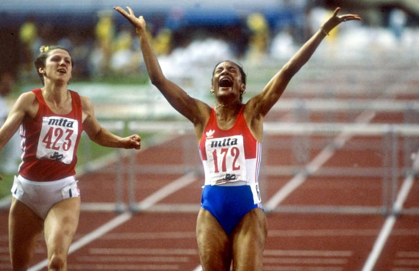Entre 1988 et 1990, les choses s’accélèrent un peu : 88, je me dis que ça serait chouette d’aller aux Jeux Olympiques et j’y vais ; 89, je suis championne du monde universitaire au 100m haies ; 90, c’est l’année des championnats d’Europe. Pour les Jeux de 1988, c’était mes premiers, mais j’étais plutôt cool à part pour la sélection qui s’est faite ric-rac. Sur le « terrain », je regardais mes adversaires, un peu impressionnée quand même, c’étaient des « monstres » de l’athlé. Mais, moi, à l’époque, j’étais encore complètement rêveuse, je me disais qu’il y avait toujours une surprise aux Jeux et que ce serait moi. Je rêvais un peu… Mais bon, je n’avais rien à perdre. C’était déjà bien d’être en finale. Ça ne m’a pas démoralisé de terminer septième parce que je me suis dit « Oh, je ne suis pas dernière » !