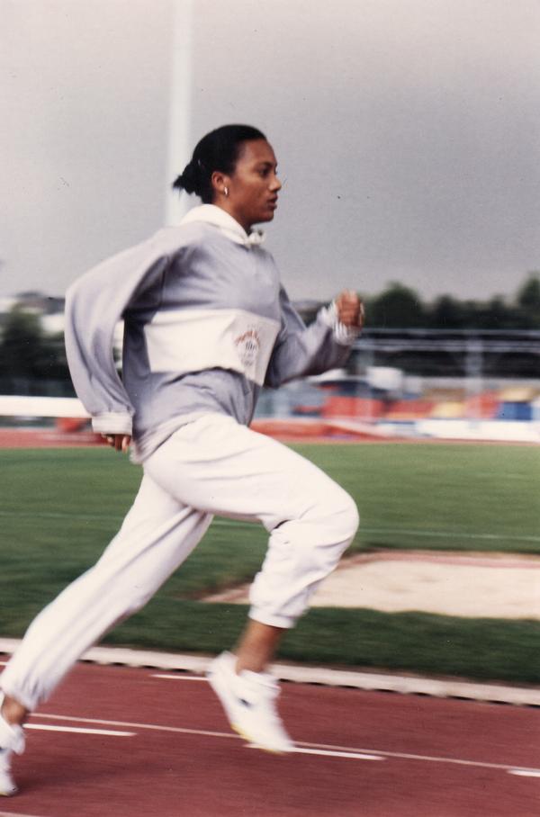 « Moi, j’aurais voulu être danseuse comme dans le film Fame, mais je me suis mise à l’athlétisme par mimétisme, comme ma sœur (Maryse Ewanjé-Epée, record de France du saut en hauteur de 1983 à 2007, Ndlr). J’ai fait les deux sports en parallèle à partir de mes 11-12 ans jusqu’à mes 21 ans. À un moment donné, il a fallu que je fasse un choix. Comme l’athlé me forgeait un certain corps et qu’en plus, j’étais très grande, je mesure 1,76m, j’ai vite vu mes limites en danse. L’athlétisme, je démarre donc au même âge que la danse, en club. Et… ça marche. Tout de suite. Il faut dire que je cavalais hyper bien. Je suis rentrée dans le club de Montpellier Université Club où était ma sœur Maryse, avec son entraîneur Dominique Biau. Je faisais de l’heptathlon et du saut en hauteur.