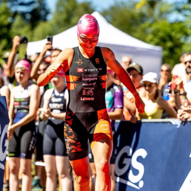 Après être entrée en école, j’ai décidé de me diriger vers le duathlon où il n’y a pas de natation. De nouveau, j’ai fait des belles épreuves en première division et, après sept ans de pratique, mon niveau en course à pied pure commençait à ne plus suffire pour être à l’avant de la course et j’ai eu envie de voir autre chose. C’est là que j’ai découvert le cross triathlon. Le plus compliqué, pour moi, a été de me mettre au VTT à 28 ans, mais ça a été une formidable découverte.