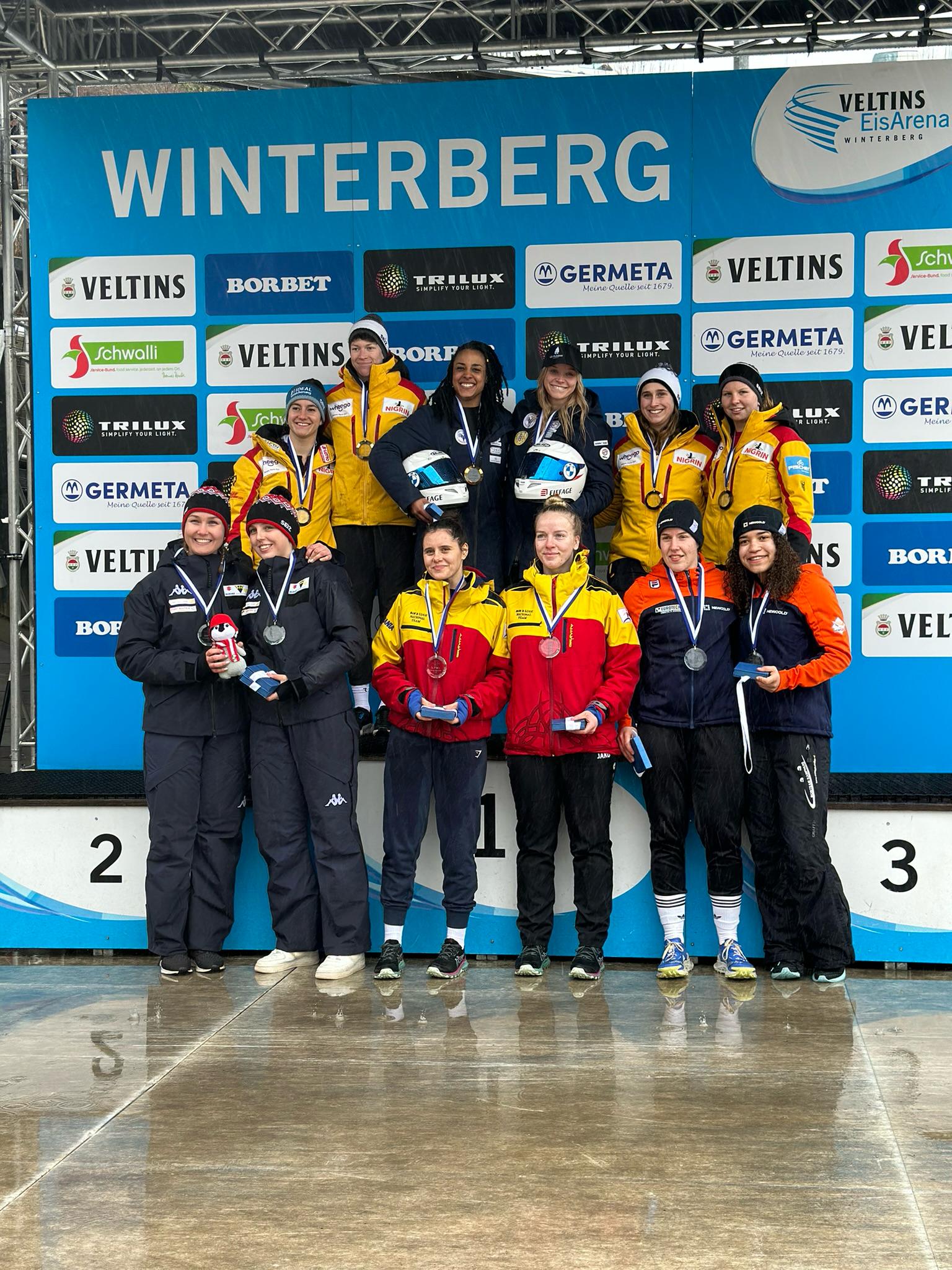 Je passe donc les sélections de septembre 2022, Carla gagne et je me classe deuxième. Je suis donc remplaçante et je peux quand même faire une compet’ cette année-là. L’idée est de faire souffler la titulaire et de faire travailler la remplaçante. C’est la Coupe d’Europe et on fait championnes d’Europe juniors en Bob à 2 avec Margot, mon premier titre en bob ! Cette même année, en plus, on fait 5e aux championnats du monde – c’est Carla qui concourt pour ce que l’on appelle « la team Boch ». Là, c’est un sacré accomplissement !